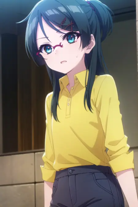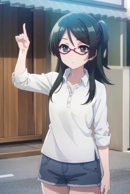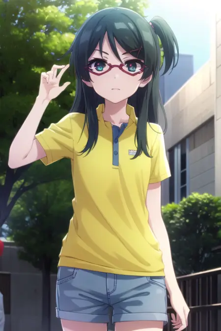 suzuka kurihara, long hair, black hair, hair ornament, (green eyes:1.3), glasses, hairclip, one side up, red-framed eyewear,