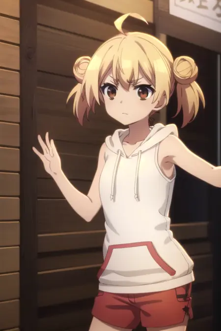 tatsuko gakumazawa, bangs, blonde hair, hair between eyes, (brown eyes:1.5), ahoge, hair bun, double bun, thick eyebrows, child, female child,
