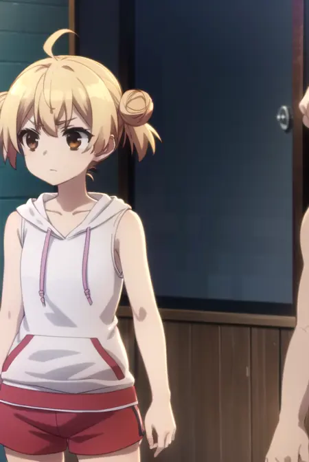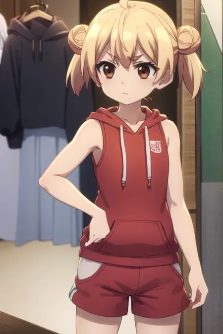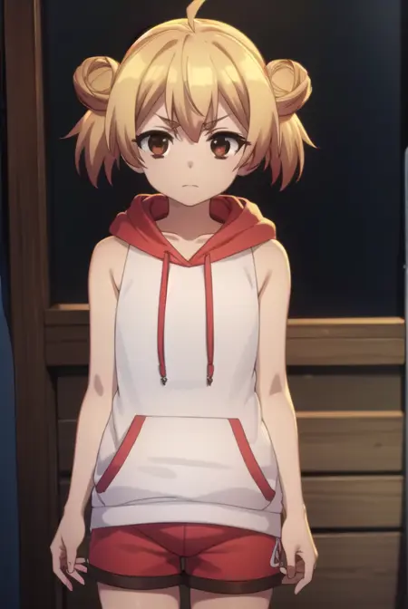 bare shoulders, shorts, sleeveless, hood, bare arms, short shorts, sleeveless shirt, hoodie, hood down, red shorts, white hoodie, sleeveless hoodie,