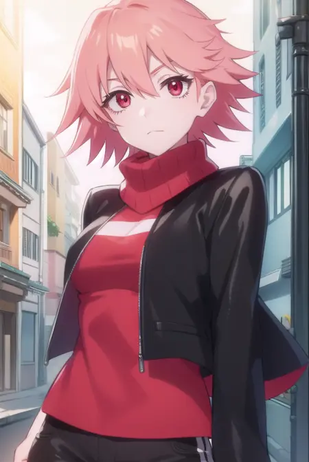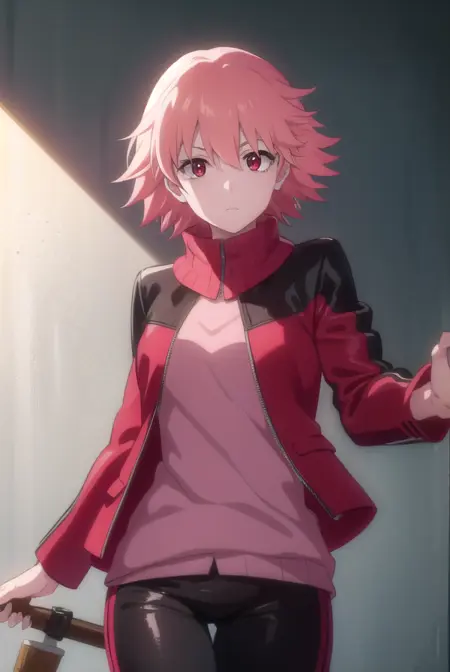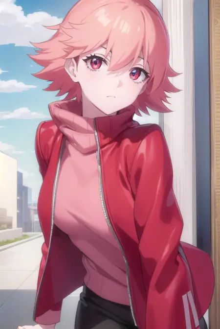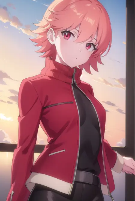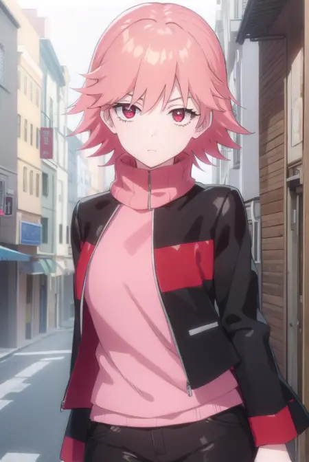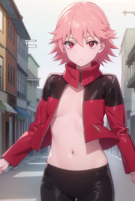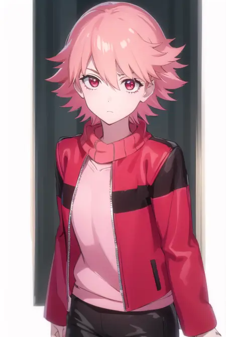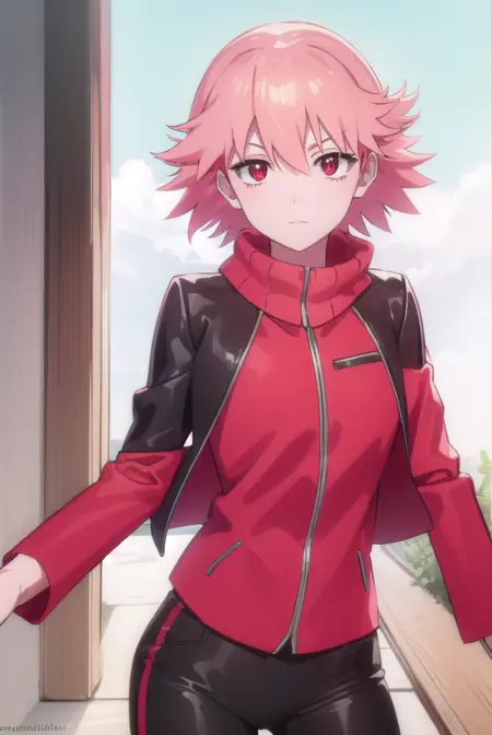 jacket, red jacket, shirt, pink shirt, pants, black pants,