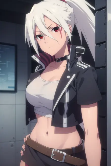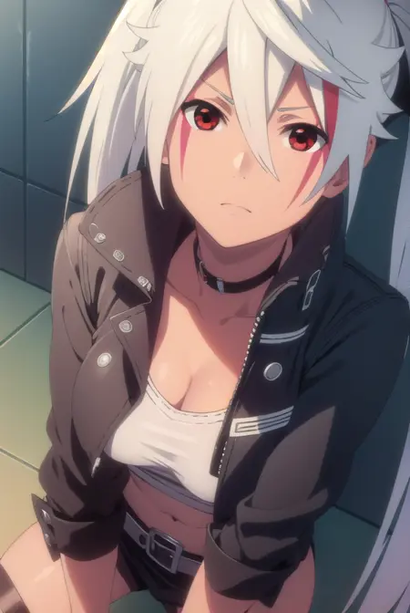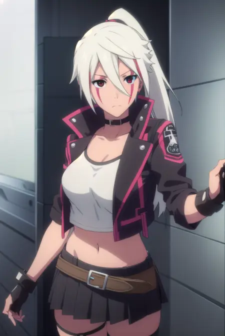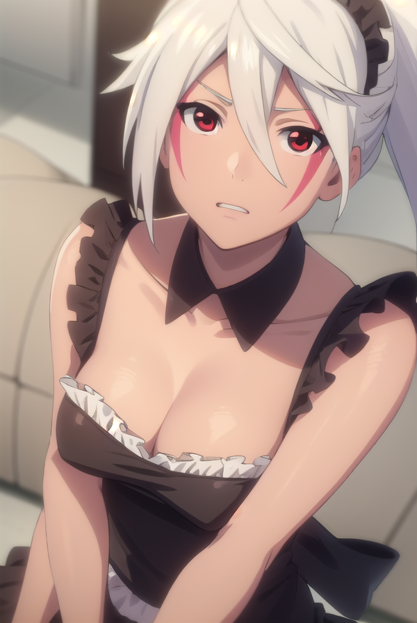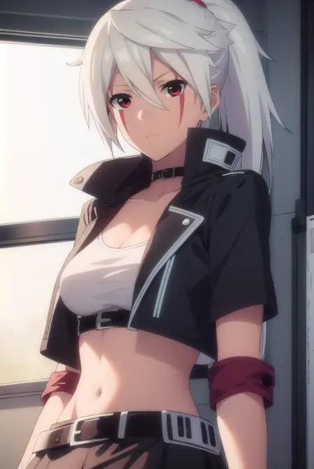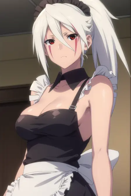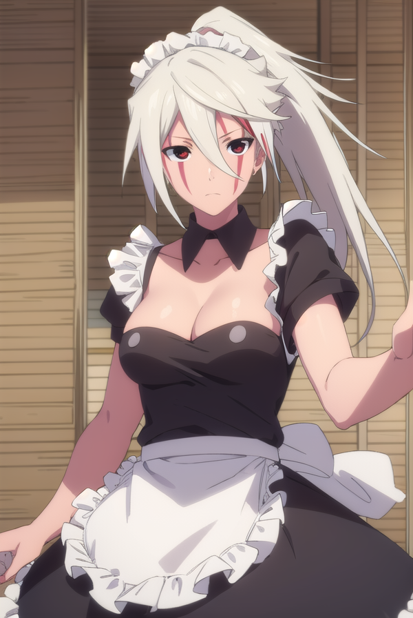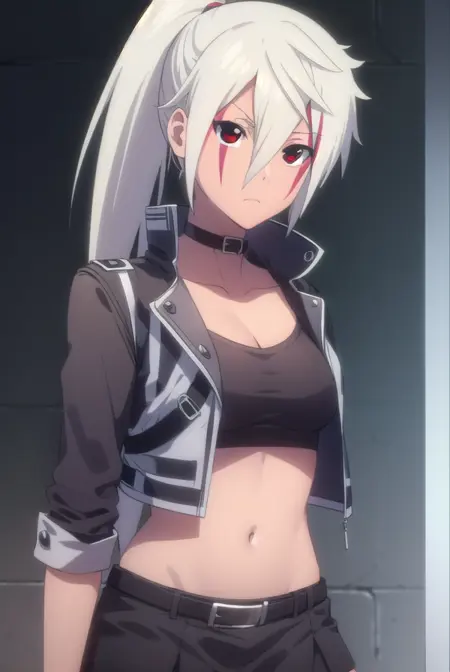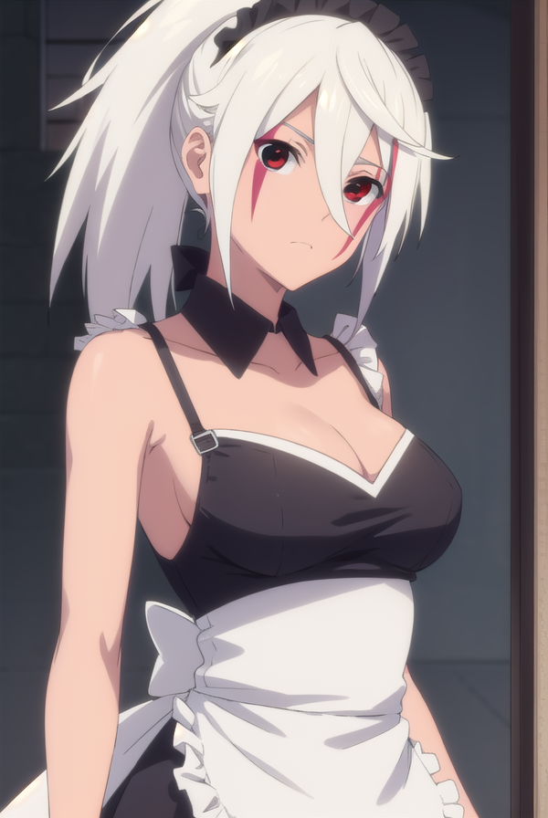 julia jinyu, long hair, (red eyes:1.3), ponytail, white hair, dark skin, dark-skinned female, facial mark, facepaint,