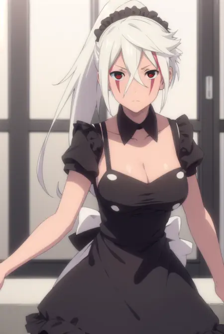 dress, cleavage, short sleeves, frills, apron, black dress, maid, maid headdress, detached collar, white apron, maid apron, enmaided,