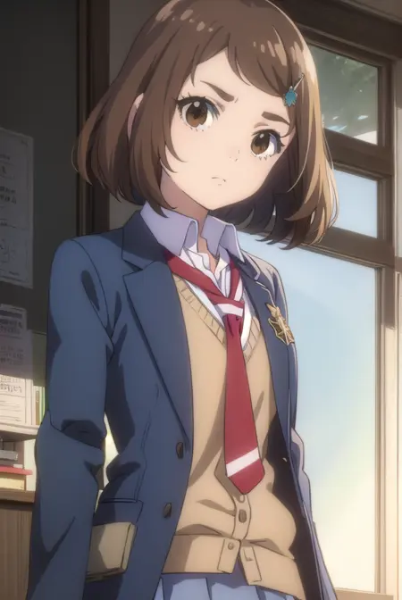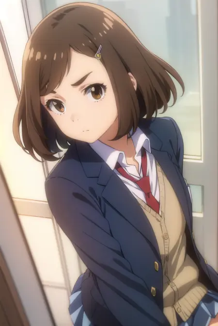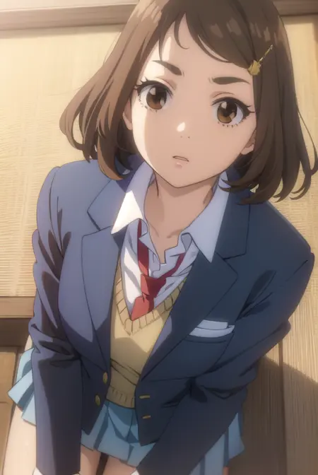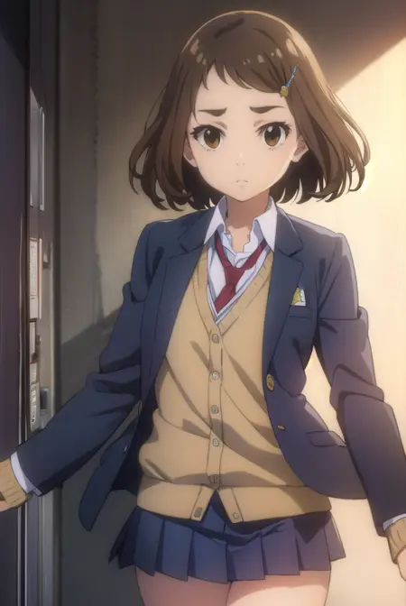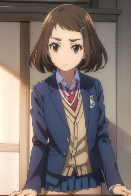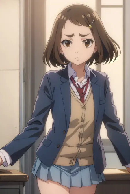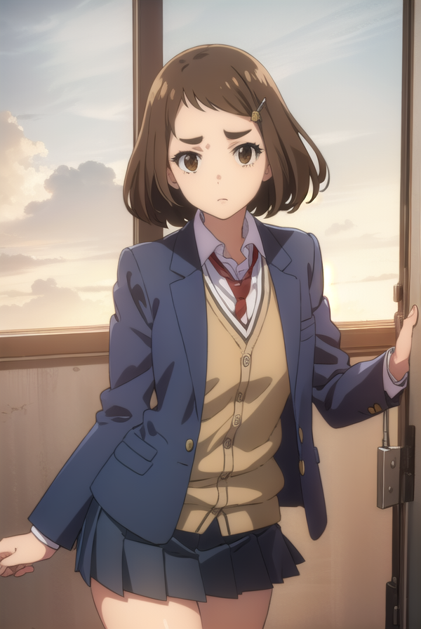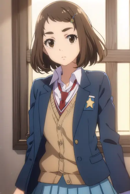 kana koumoto, short hair, brown hair, hair ornament, (brown eyes:1.5), hairclip,