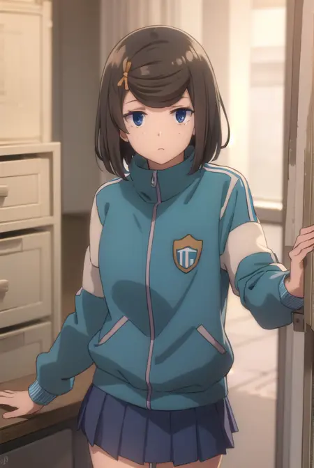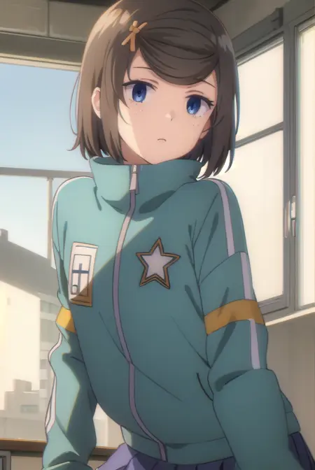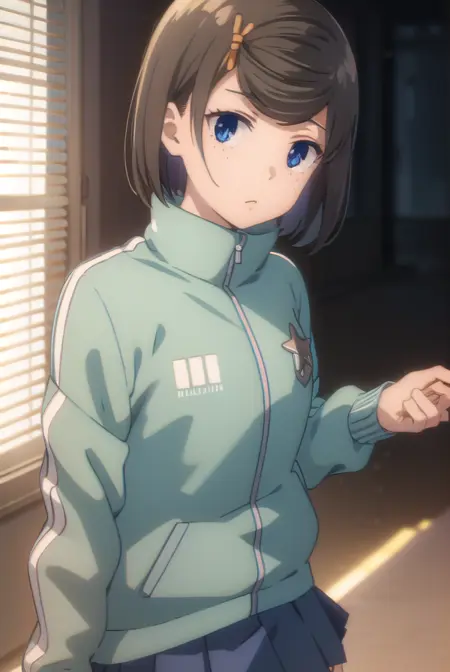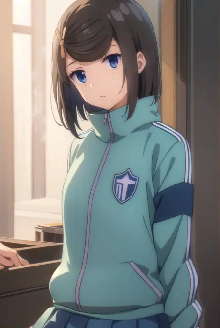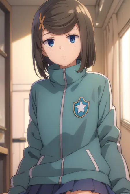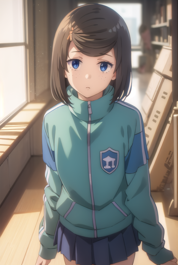 tomomi hetada, short hair, blue eyes, brown hair, hair ornament, hairclip, (swept bangs:1.5), freckles,