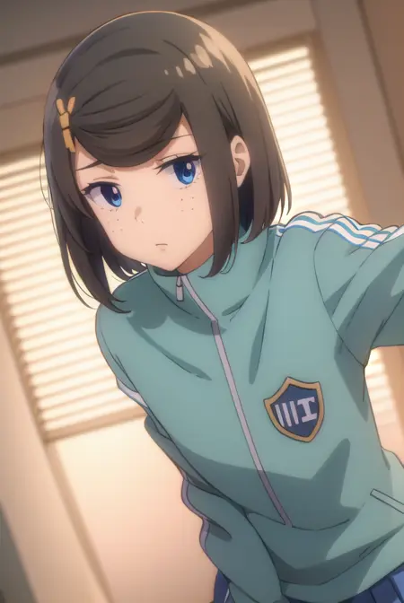 tomomi hetada、ショートヘア、青い目、茶色の髪、髪飾り、ヘアクリップ、(流れる前髪:1.5)、ほくろ、