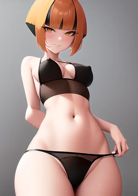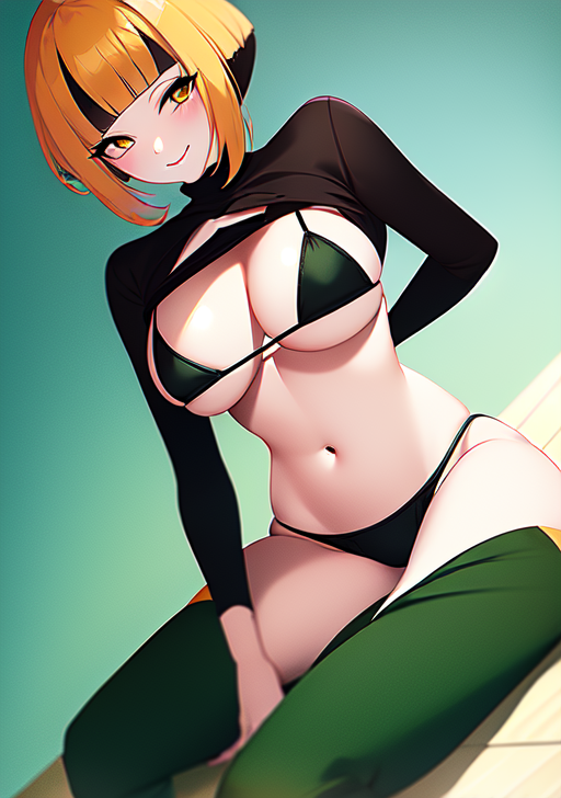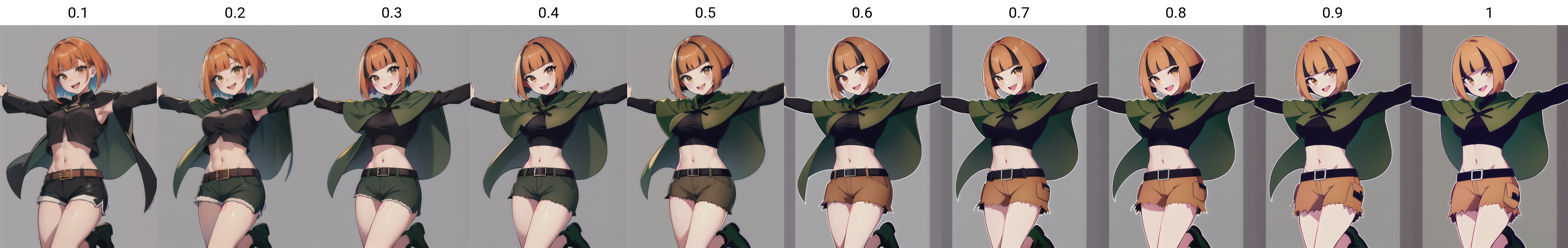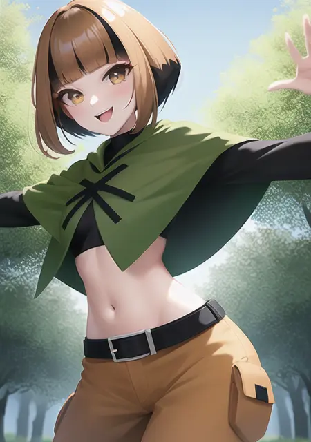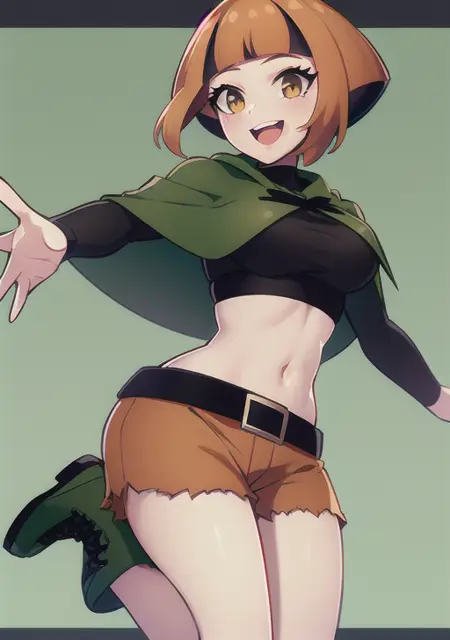 prompt used : gardenia, 1girl, breasts, looking at viewer, blush, smile, short hair, open mouth, bangs, brown hair, shirt, black hair, long sleeves, navel, brown eyes, :d, sidelocks, multicolored hair, boots, shorts, teeth, tongue, midriff, belt, blunt bangs, twitter username, orange hair, two-tone hair, crop top, torn clothes, black shirt, capelet, upper teeth only, outstretched arms, black belt, green footwear, torn shorts, poncho, green capelet