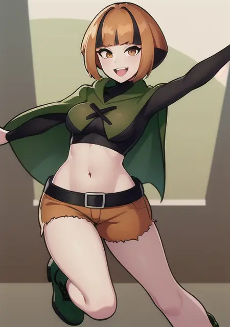 使用的提示词:gardenia, 1girl, breasts, looking at viewer, blush, smile, short hair, open mouth, bangs, brown hair, shirt, black hair, long sleeves, navel, brown eyes, :d, sidelocks, multicolored hair, boots, shorts, teeth, tongue, midriff, belt, blunt bangs, twitter username, orange hair, two-tone hair, crop top, torn clothes, black shirt, capelet, upper teeth only, outstretched arms, black belt, green footwear, torn shorts, poncho, green capelet