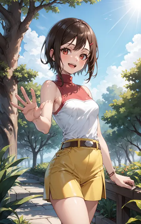 short hair, brown eyes, red eyes, brown hair, hair ornament, hairclip