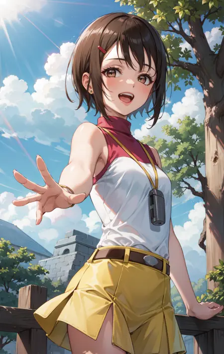 shirt, bare shoulders, elbow gloves, gloves, skirt, jewelry, sleeveless, belt, turtleneck, yellow skirt, whistle, whistle around neck, fingerless gloves