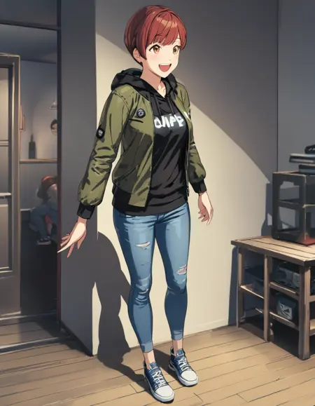 Joy from Payday 2. Trained on Animagine 3.0 . Prompt is "Joypayday", "Jacket,hood down,black shirt,jeans" for her default in-game outfit, "Very short hair,pixie cut" for her exact hairstyle.