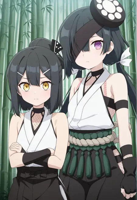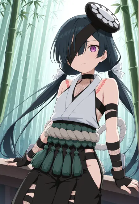 Bunny: very long hair, black hair, hime cut, bandage over one eye, purple eyes, body markings, low twintails, ninja, fishnets, hat, fingerless gloves, sleeveless, armlet, pants, hip vent, Clothing Cutout, rope belt
