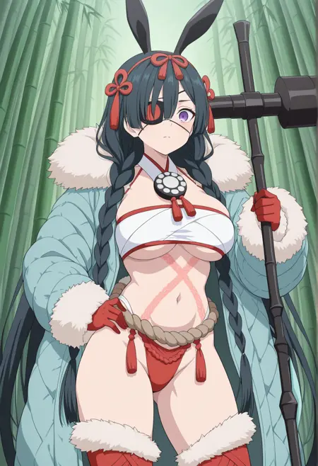 Second Ascension: very long hair, twin braids, ribbon, hair ornament, bunny ears, black hair, hime cut, eyepatch, purple eyes, body markings, revealing clothes, tube top, coat, fur trim, red gloves, red panties, rope belt, red thighhighs,