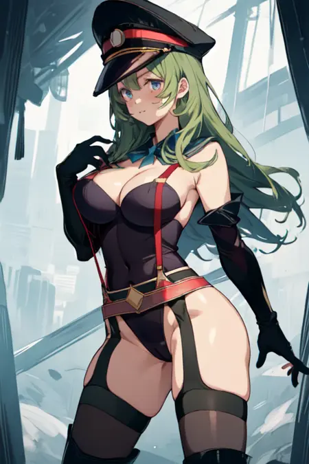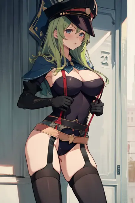KanakoWatanabe, 1girl, solo, long hair, blue eyes, large breasts, black thighhighs, elbow gloves, cleavage, green hair, suspenders, peaked cap, leotard, cameltoe, garter straps, suspenders,