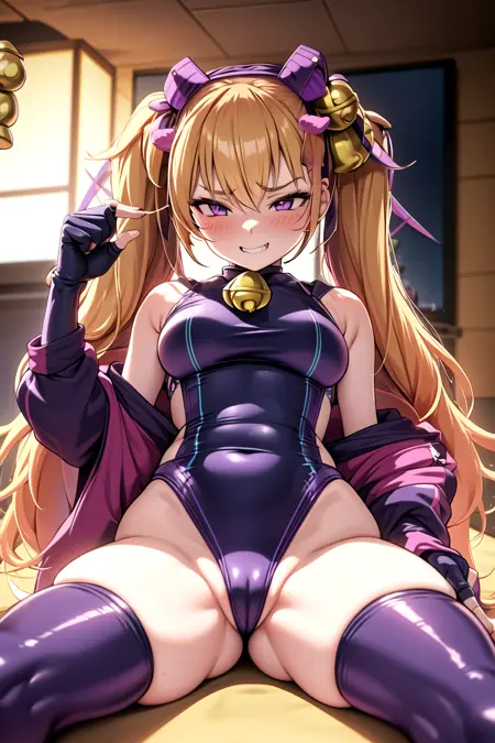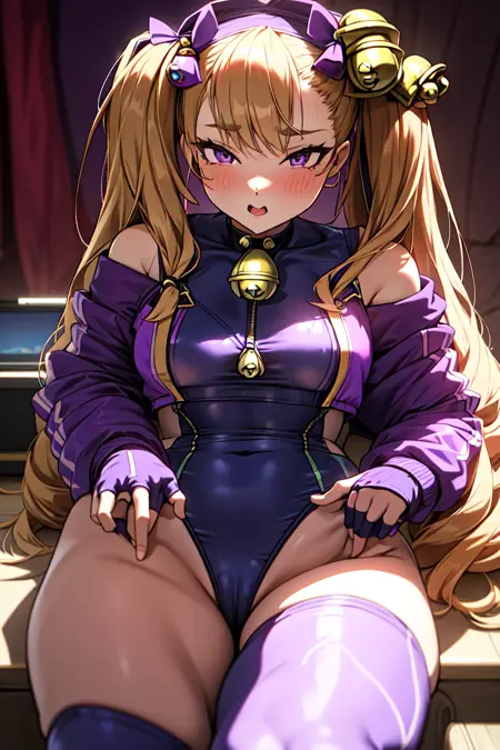 purple eyes, blonde hair, twintails, long hair, hairband, (Bell hair ornament) ,