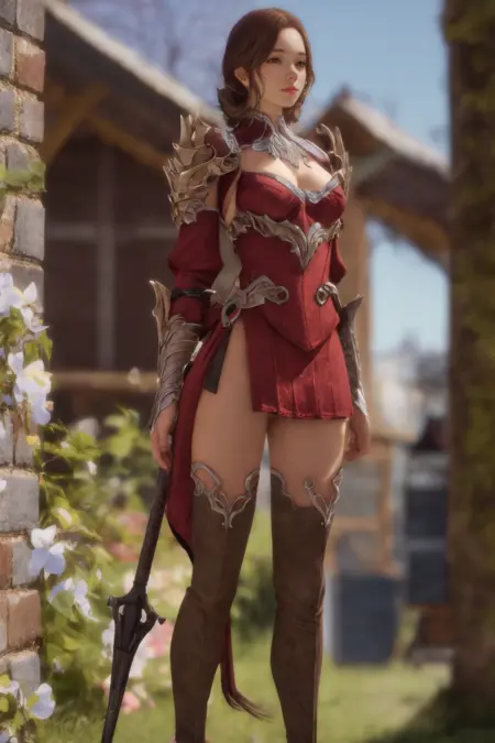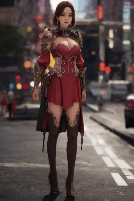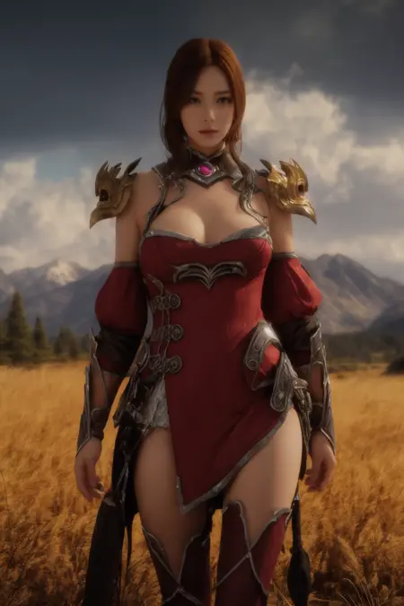 Suggested to include "red dress,thigh boots,pauldrons,armor" in your prompt if you wish to achieve a look closer to original outfit.
