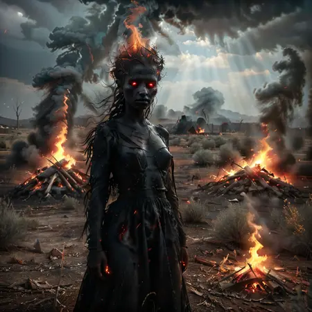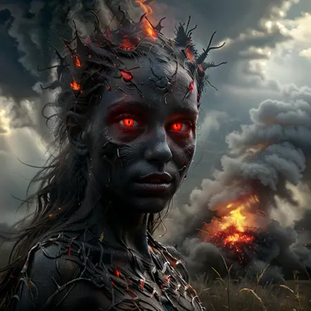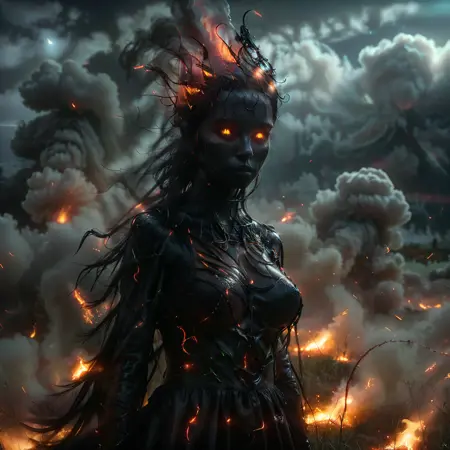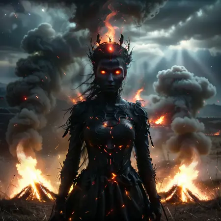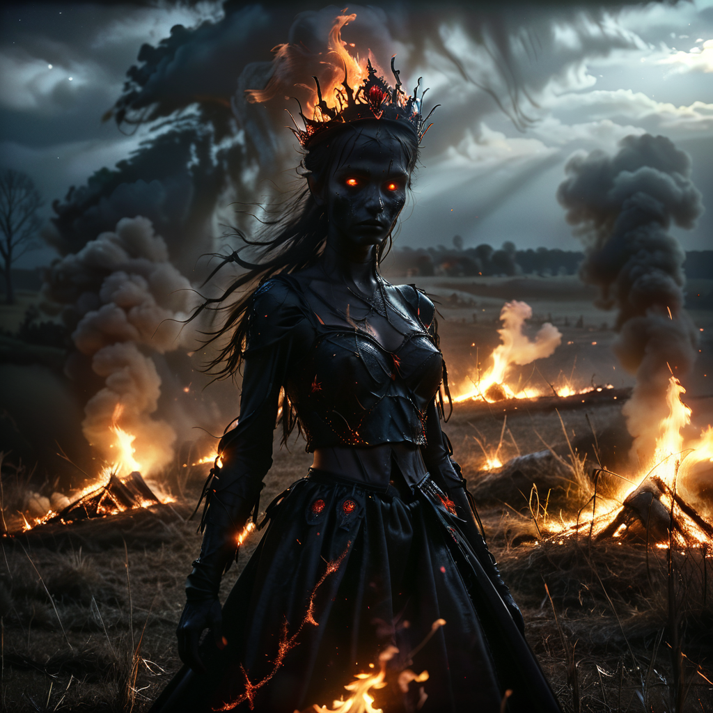 1girl, bare shoulders, black dress, black hair, blood, breasts, burning, cape, cleavage, cloud, cloudy sky, colored skin, crown, dark, dress, embers, fire, flame, fog, forest, full body, glowing, glowing eyes, grass, grey skin, holding, holding sword, holding weapon, jewelry, long hair, looking at viewer, medium breasts, messy hair, midriff, monster, navel, night, no humans, orange eyes, outdoors, portrait, realistic, red eyes, red hair, sarzuur, skirt, sky, smoke, solo, spot color, standing, sword, teeth, tree, upper body, weapon
