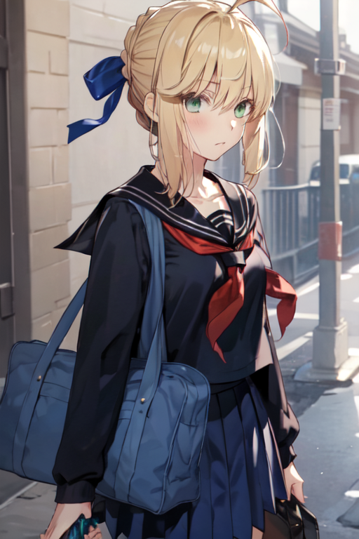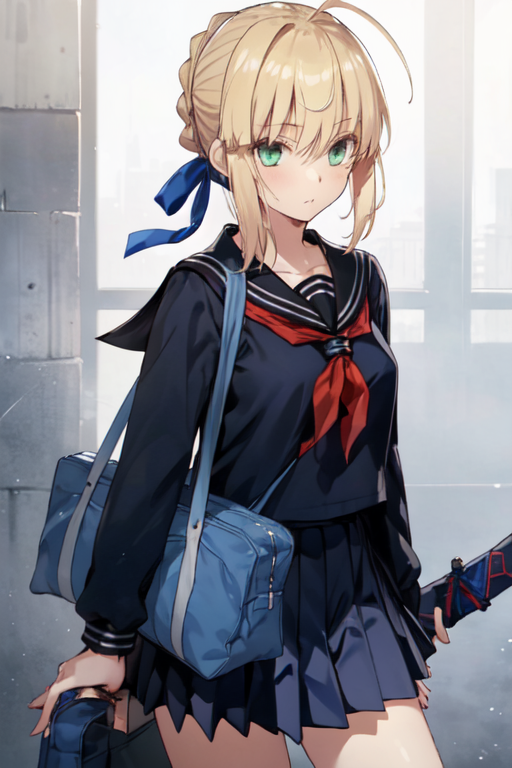 MasterArtoria, 1girl, solo, short hair, pleated skirt, blue skirt, blonde hair, school uniform, green eyes, collarbone, hair ribbon, braid, ahoge, sidelocks, blue serafuku, sword, bag, red neckerchief, blue ribbon,