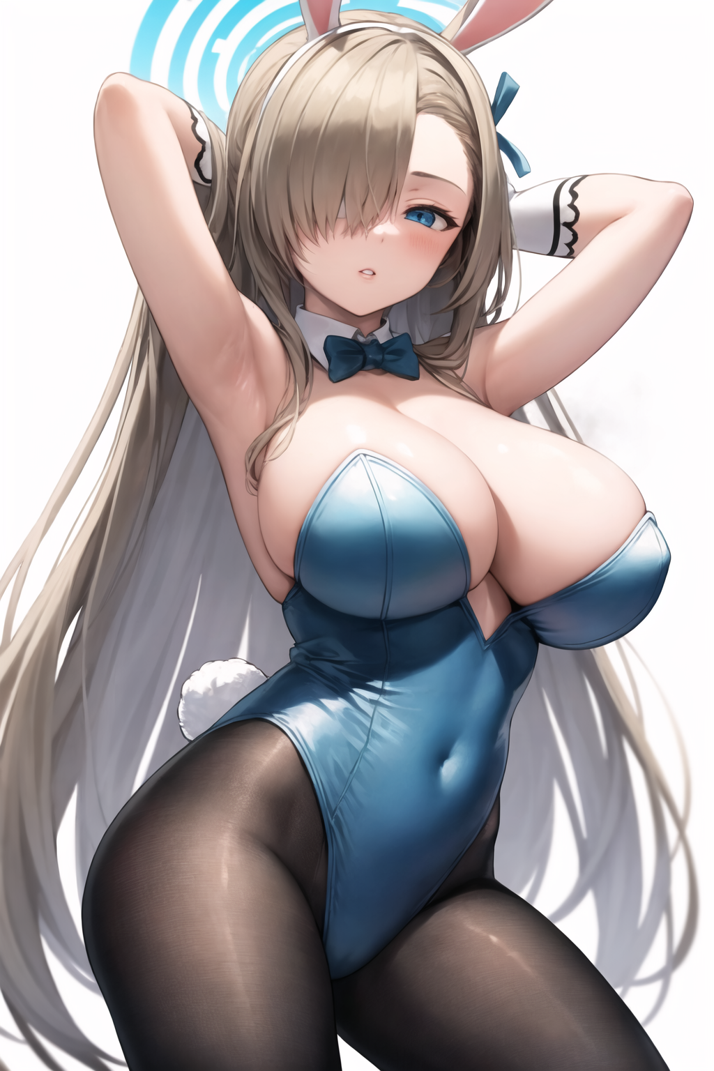 - rabbit ears, blue leotard, playboy bunny, black pantyhose, white gloves
