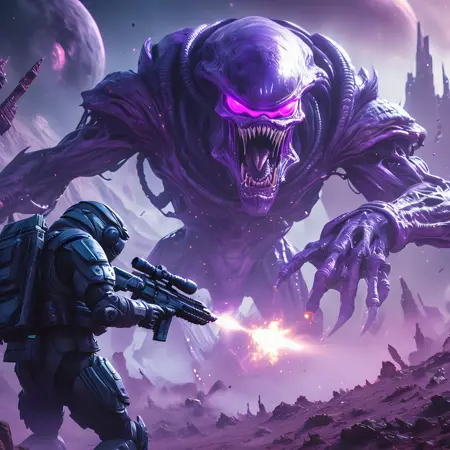 "score_9, score_8_up, score_7_up, score_6_up, score_5_up, score_4_up, ((a giant purple burning pheonix bird:1.3) standing in front of a knight, mountains in background:1.2) Bosstyle "