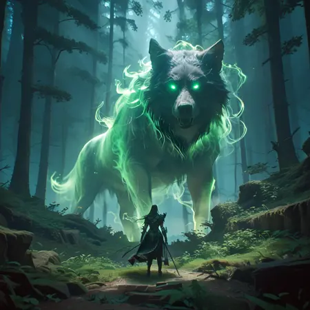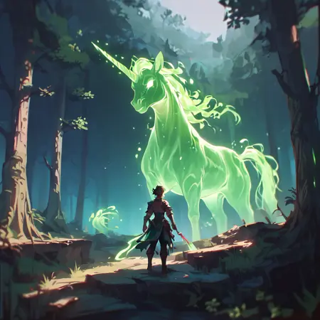 "a cinematic shot of a fantasy character standing infront of a giant green glowing spirit Unicorn, magical forest in background, reflective light, bosstyle"