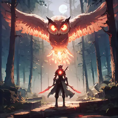"score_9, score_8_up, score_7_up, score_6_up, score_5_up, score_4_up, ((a giant purple burning pheonix bird:1.3) standing in front of a knight, mountains in background:1.2) Bosstyle "