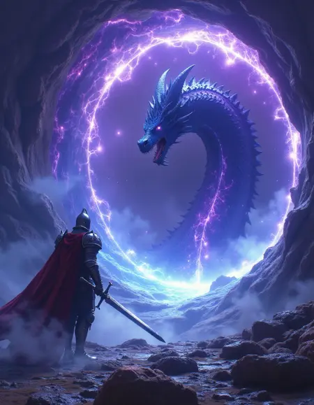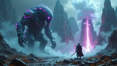 "score_9, score_8_up, score_7_up, score_6_up, score_5_up, score_4_up, ((a giant purple burning pheonix bird:1.3) standing in front of a knight, mountains in background:1.2) Bosstyle "