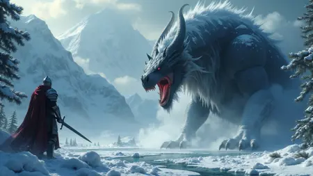 "一幅骑士与巨型奇幻冰凤凰战斗的动作画面,背景为墓地,Bosstyle,hkstyle,高清,大师级作品,最佳画质,超精细,超细节,超真实,bosstyle lora:FluxBossBattle:0.9 "