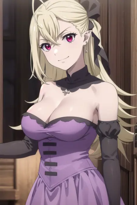 carmilla vanstein, long hair, blonde hair, (red eyes:1.3), hair between eyes, ahoge, hair bow, pointy ears,