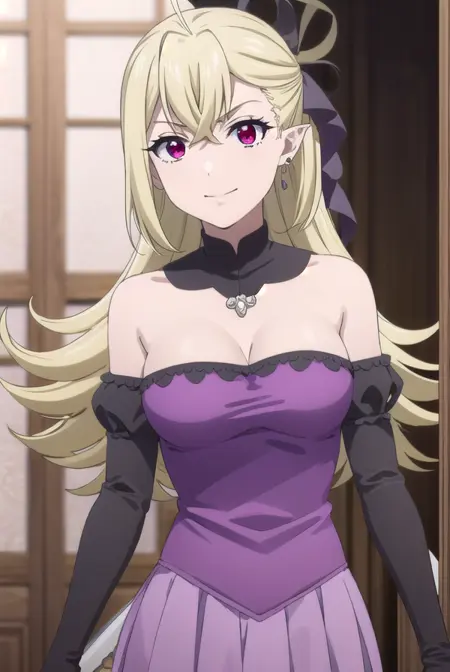 dress, cleavage, bare shoulders, jewelry, earrings, detached sleeves, elbow gloves, strapless, strapless dress, purple dress,