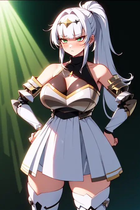 armor, breastplate, white dress, leavage cutout, long sleeves, armored dress, puffy sleeves, sleeveless ,bridal gauntlets, detached sleeves,