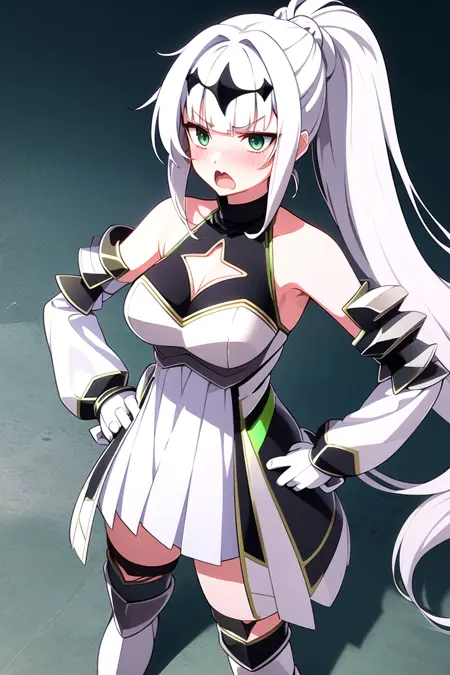 <lora:Kurowa-Chan_IL_V1:0.8>kurowa_chan, green eyes, long hair, ponytail, white hair, grey hair, bangs, hair intakes, black hair ornament, hair bun, blunt bangs, very long hair, hairband, single hair bun, jewelry,