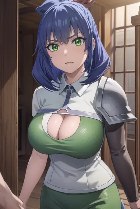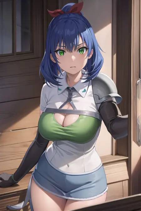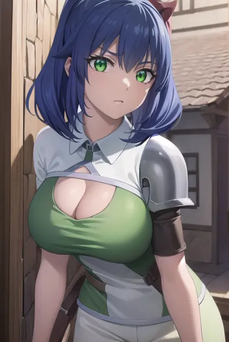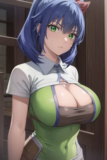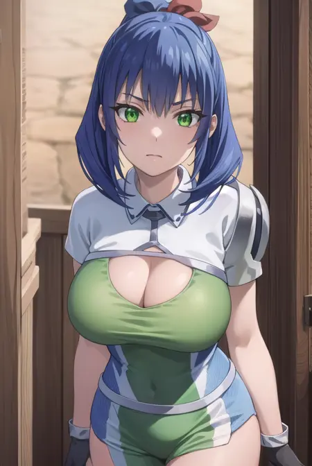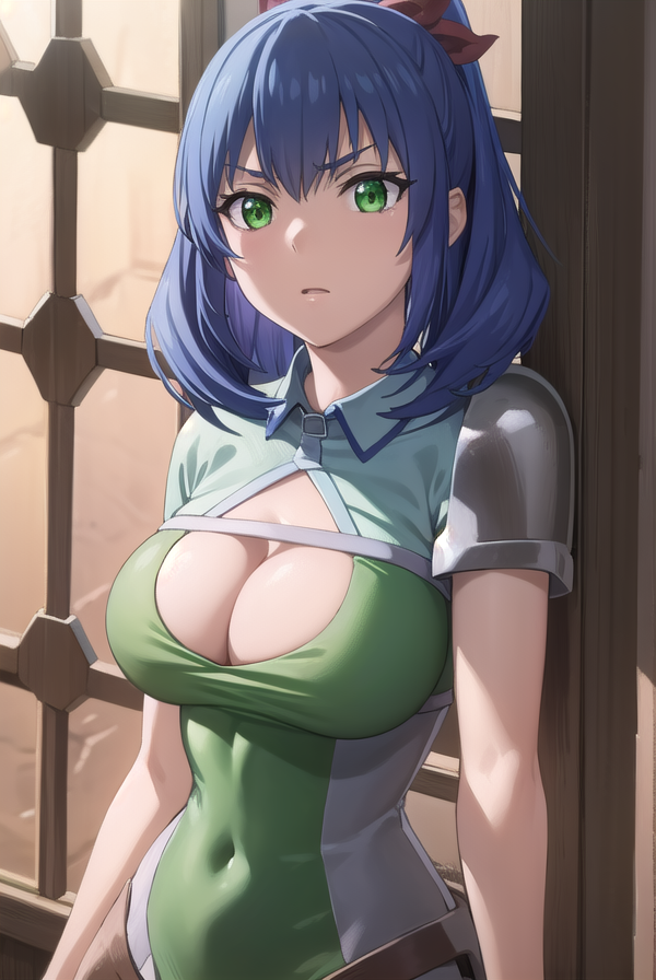celes, (green eyes:1.3), blue hair, ponytail, ribbon, hair ribbon,
