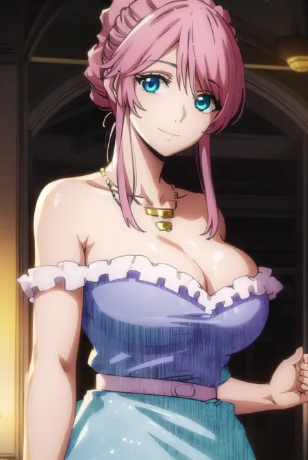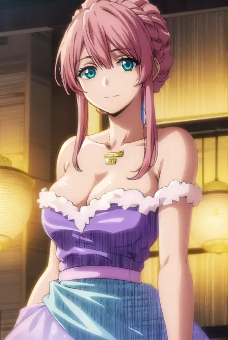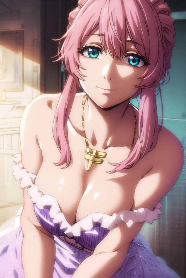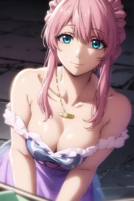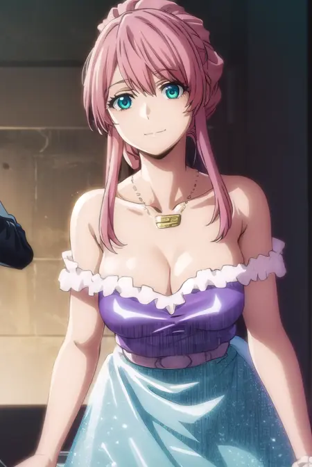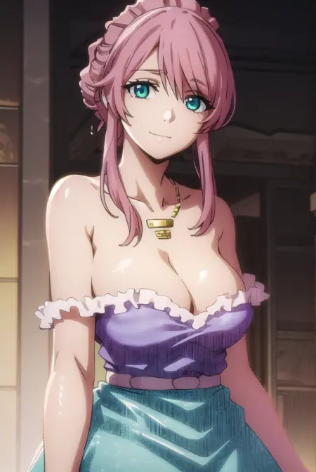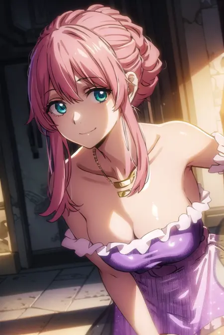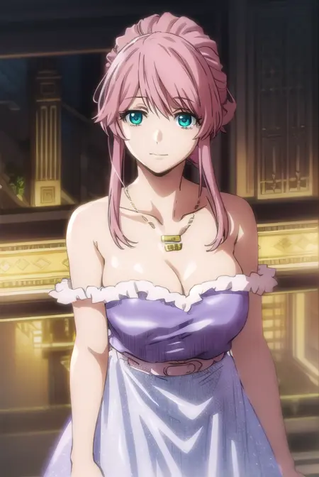 dress, cleavage, bare shoulders, jewelry, necklace, purple dress, strapless, strapless dress, collarbone,