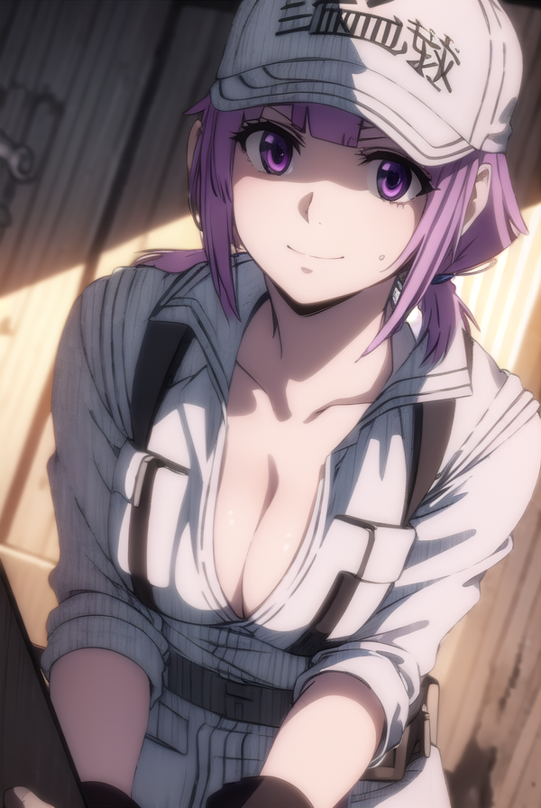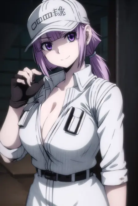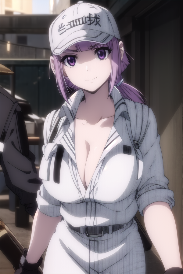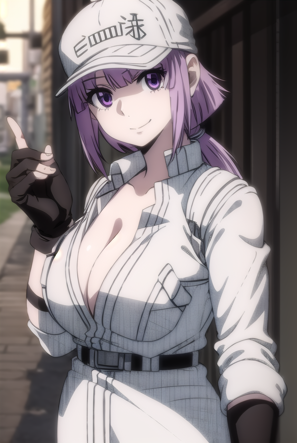 gloves, hat, cleavage, black gloves, belt, fingerless gloves, uniform, white headwear, baseball cap, white pants,