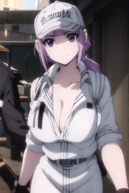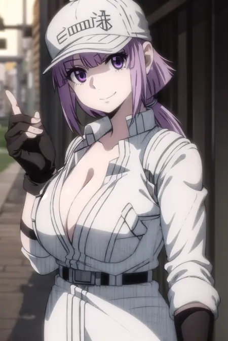 手袋、帽子、胸元、黒い手袋、ベルト、指なし手袋、ユニフォーム、白い頭部装具、ベースボールキャップ、白いズボン、