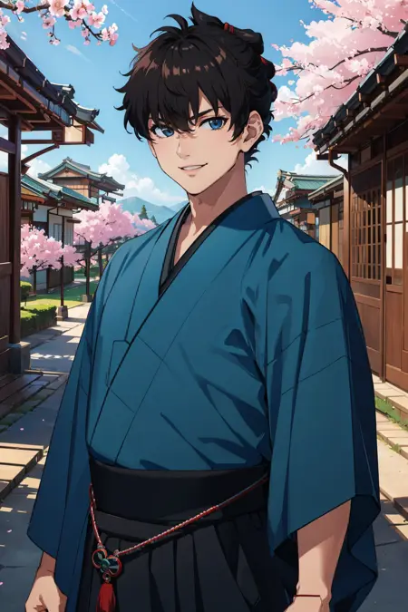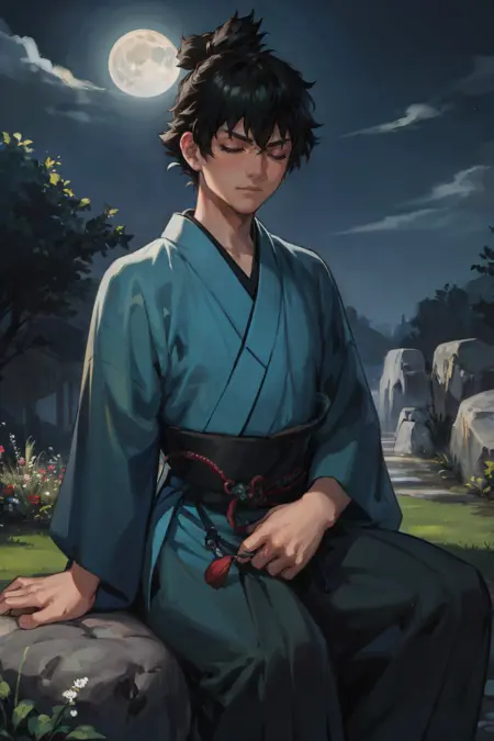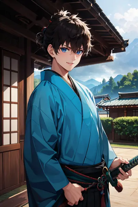 添加 "绿色和服、袴" 以呈现他的典型造型。