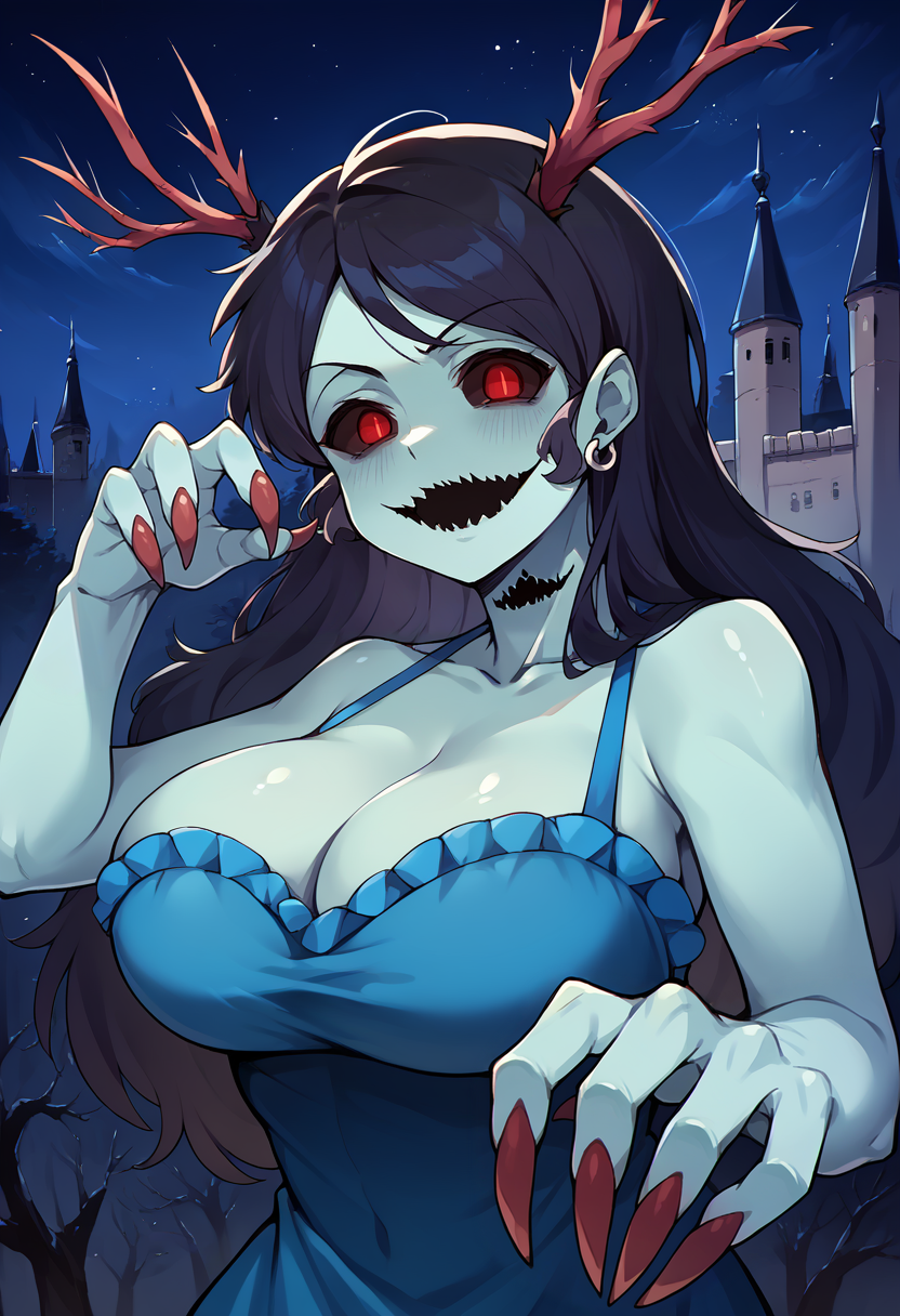Default outfit: lubella, blue skin, long hair, antlers, blue dress, bare shoulders, large breasts, cleavage, earrings, scar on neck