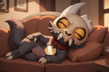 - トリガー:1boy、スカルヘルメット、歯、pokemon(生物)、色付きの虹彩、円形のペットタグ付き赤い首輪、爪、尻尾
