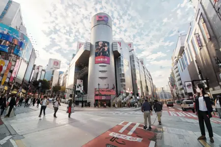 shibuya109, storefront, car, road, real world location, traffic light, outdoors, street, crosswalk, building, city, sign, sky, scenery, road sign, cloud, multiple boys, day, lamppost, 6+boys, brown hair, tree