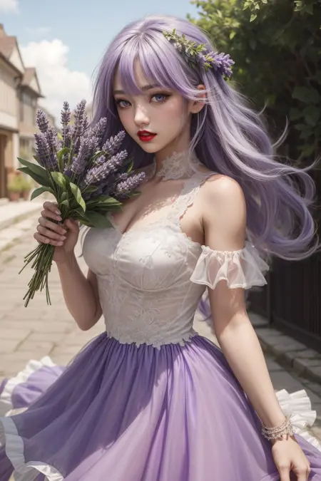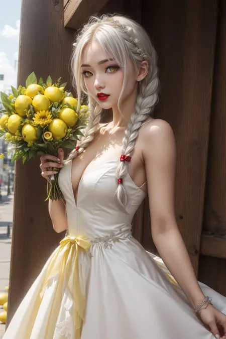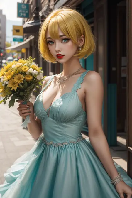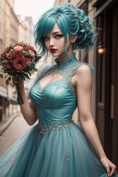 Pose you person half turned, looking at the camera with one hand down at their side and one holding an object that you specify in the prompt (e.g. holding a bouquet, holding a flower, etc).