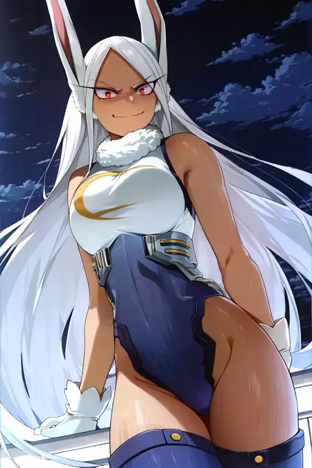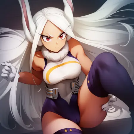 mirkomha및boku no hero academia도움이 될 수 있는 설명 태그: `화이트 레오타드, 보라색 패딩 허벅지통, 토끼 귀, 빨간 눈동자, 슬리브리스, 흰 장갑, 하이레그 레오타드, 흰 머리카락, 매우 긴 머리카락, 큰 가슴, 털 목두드, 검정 피부, 검정 피부 여성