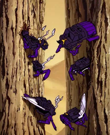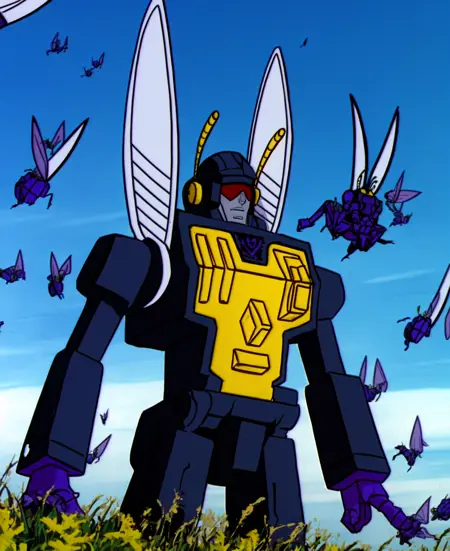 The Insecticons are a group of insectoid troublemakers. Aside from their individual talents, as a group, these insect Decepticons also display a wide array of unique abilities: Eating both organic and inorganic matter for energy, they can clone themselves and harness lightning. They are 'Shrapnel', 'Bombshell' and 'Kickback'.