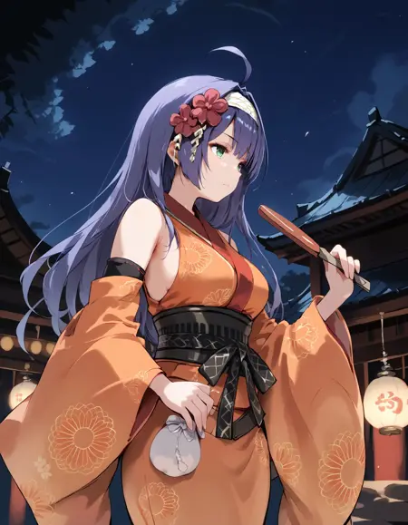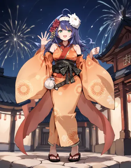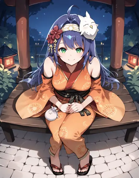 Add "hairband,mask on head,hair ornament,orange kimono,detached sleeves,sash,pouch,sandals" for her summer festival look.(yukata_v1.0)