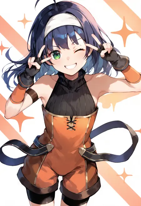 Add "white hairband,shoulder armor,orange dress,sleeveless turtleneck,belt,fingerless gloves,thighhighs,boots" for her typical look.(default_v1.0)