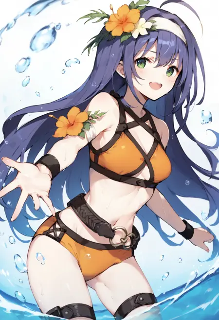 Add "orange bikini,armband,wristband,thigh strap,belt,sandals" for her summer look.(summer_v1.0)