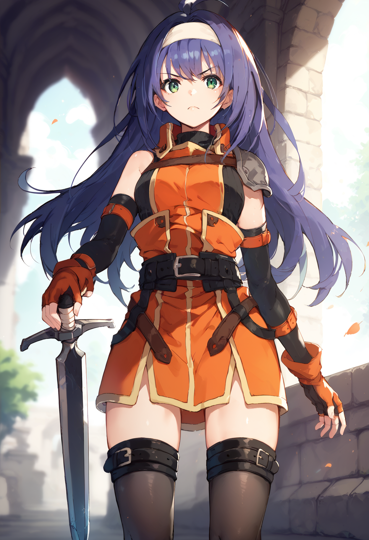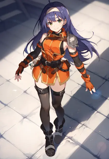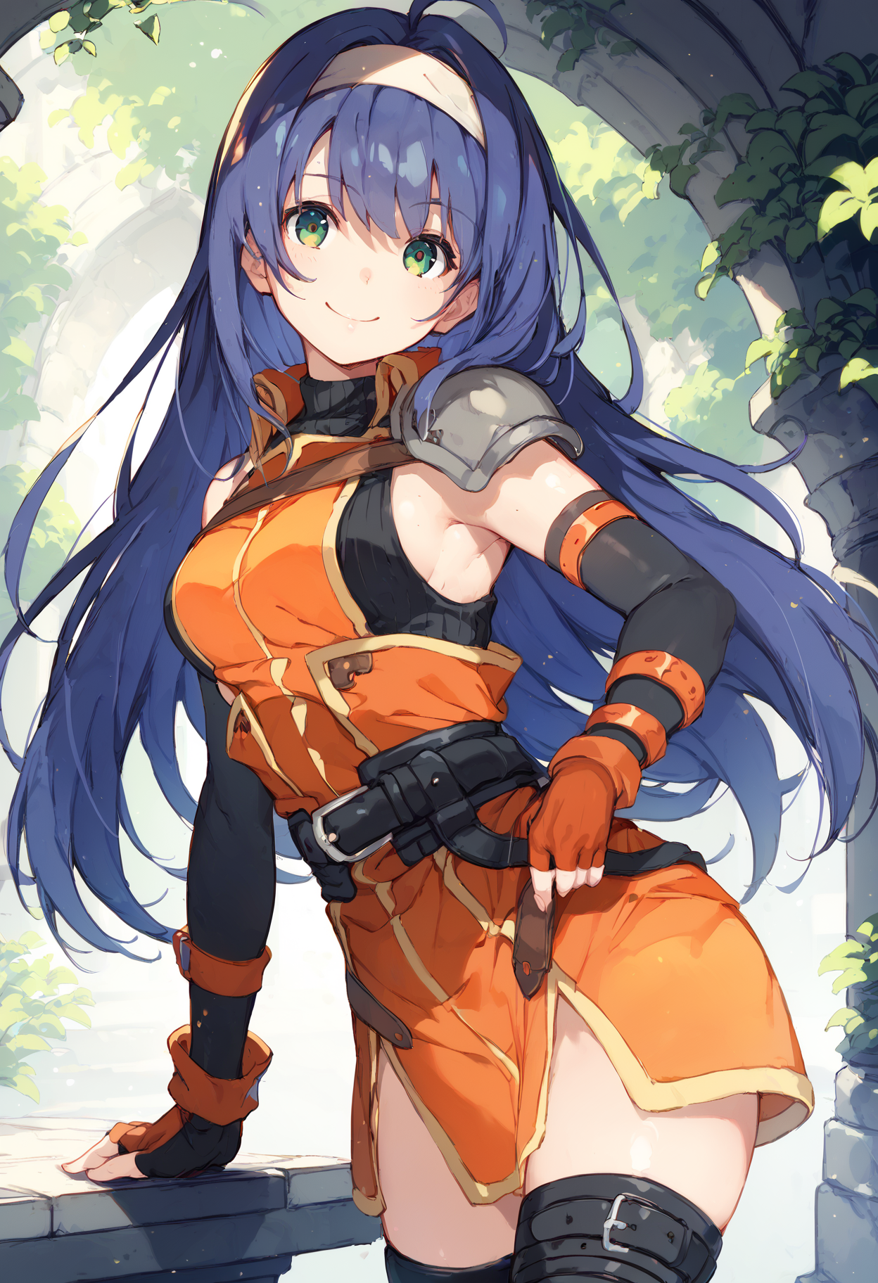 Add "white hairband,shoulder armor,orange dress,sleeveless turtleneck,belt,fingerless gloves,thighhighs,boots" for her typical look.(default_v1.0)