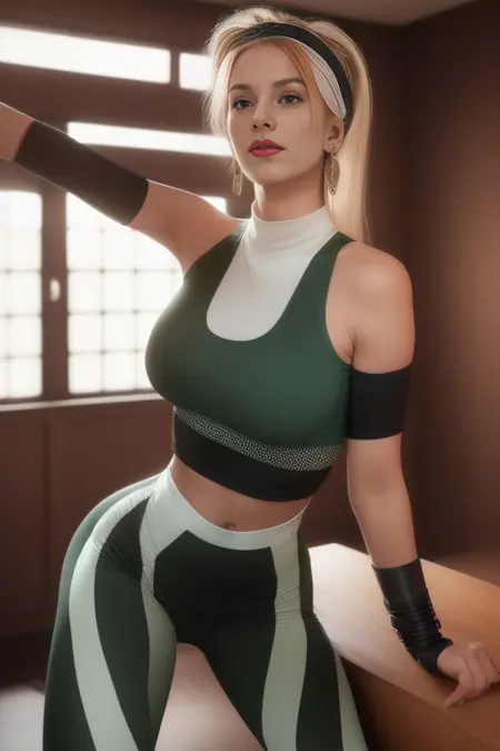 mk3sonya, sonya blade, mk3, gloves, armlet, headband, bare shoulders, lipstick, pants, ponytail, blonde hair, medium breasts, green leggings, crop top, long hair, earrings, midriff, navel