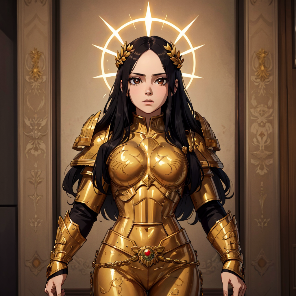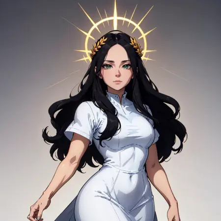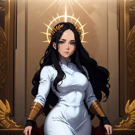 1girl, solo, god empress, long hair, black hair, brown eyes, laurel crown, parted bangs, forehead, halo,