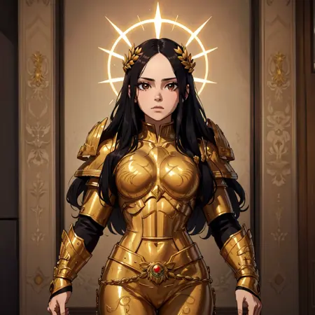 1girl, solo, god empress, long hair, black hair, brown eyes, laurel crown, parted bangs, forehead, halo,