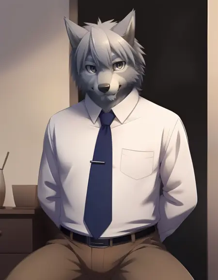 관련 단어: grey fur, white fur, two-tone fur, body fur, medium hair, grey hair, facial hair, beard, chest hair, black eyes, wolf tail, wolf boy, wolf ears, animal ears, animal nose, snout, glasses, belt, blue necktie, formal, male underwear